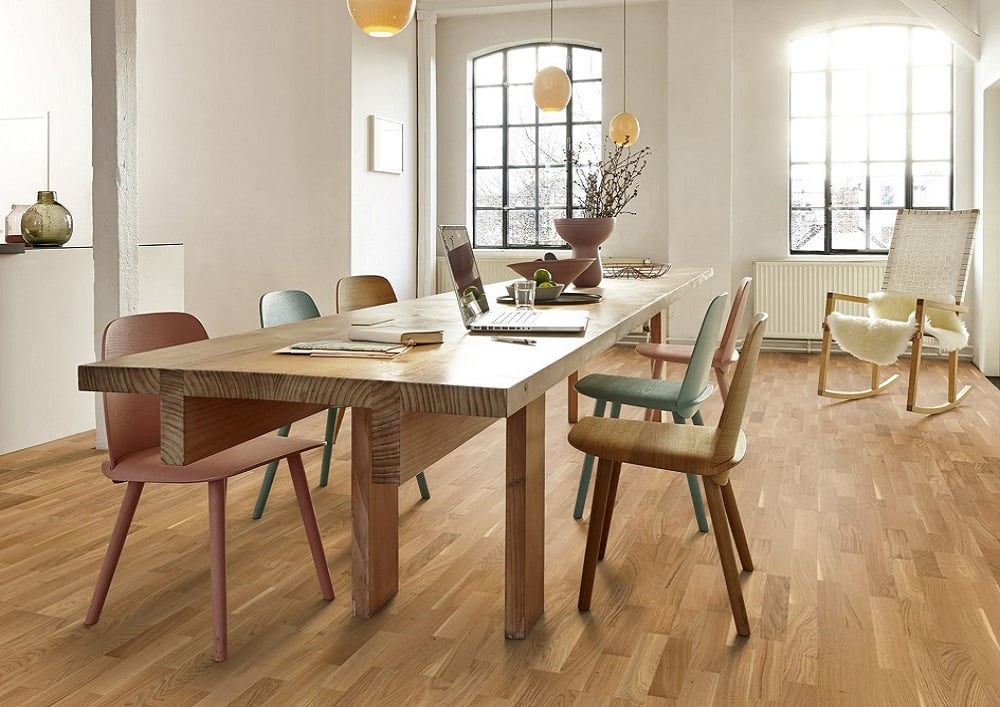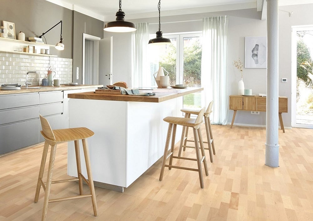 Wird heutzutage überwiegend als Fertigparkett 3-Schicht in Eiche, Ahorn oder Buche farblos matt lackiert gekauft und eingesetzt.